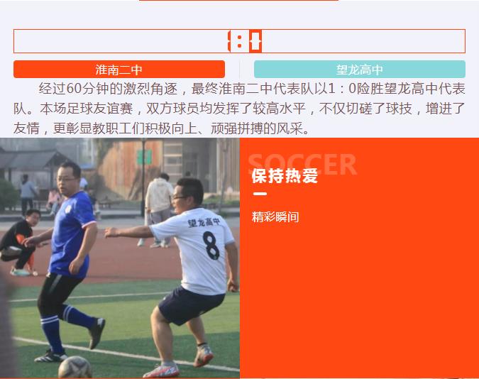 為促進(jìn)校際交流,營造輕松愉悅的工作環(huán)境,增強(qiáng)團(tuán)結(jié)合作意識(shí),近日,應(yīng)楊成禮校長邀請(qǐng),淮南二中副校長楊潔女士率領(lǐng)該校教職工足球隊(duì)親臨望龍綠茵場(chǎng),與我校教職工足球隊(duì)展開一場(chǎng)足球友誼賽。